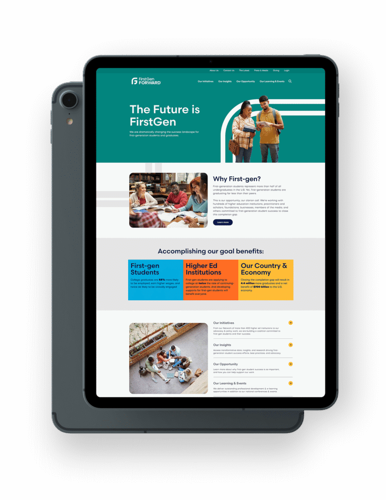 As the Design and Digital Innovation Manager, I helped shape FGF’s creative vision—blending strategy and design to ensure every publication, digital ad, academic guide, or video aligned with the mission of advancing first-generation college student success. One of my first major projects was leading the organization’s rebrand, transitioning from the Center for First-generation Student Success into the new standalone FirstGen Forward. This work included developing fresh brand assets, creating new materials, and updating existing research to ensure a cohesive and unified identity.
