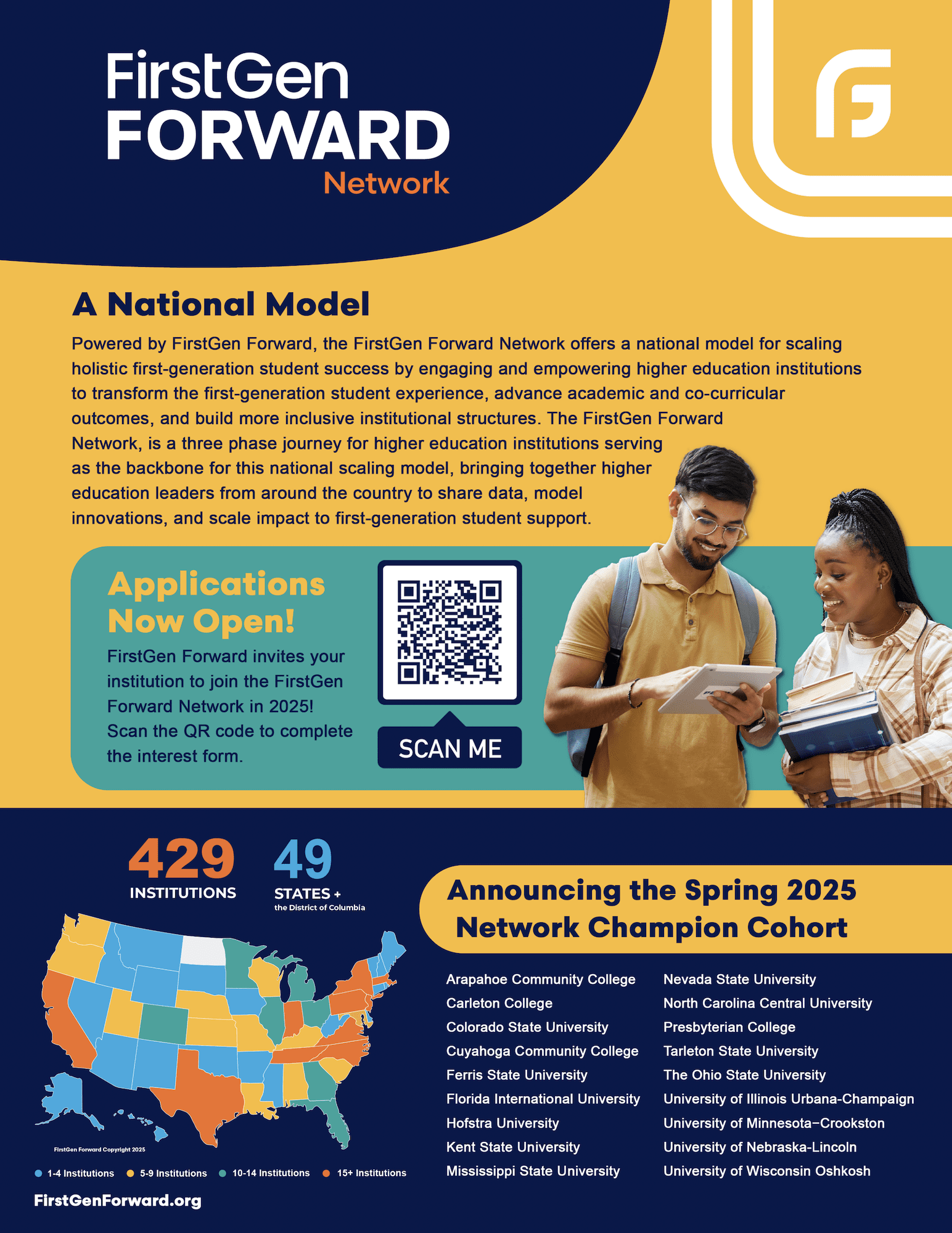 FirstGen Forward is a national non-profit dedicated to fostering success for first-generation students by partnering with higher education, philanthropy, business, government, and individuals to eliminate the completion gap and expand post-college opportunities.